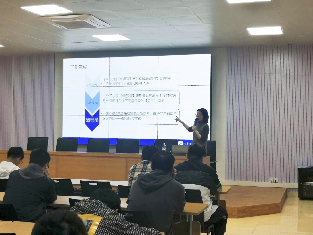 大学生发展辅导中心王芙颂老师担任主讲,培训内容包括“心情预报”工作要点、心理危机的识别以及如何应对心理危机三个方面。培训从“心情预报”工作出发,首先向同学们介绍了学校关于“心情预报”及心理委员、气象员的相关工作要求,并对同学们的工作提出了要求及期望;培训第二部分从心理危机识别的相关知识展开,介绍了异常心理的识别及需要更多关注的人群特征等专业知识,并学生心理骨干视角出发,阐明了朋辈队伍在心理危机预防与干预工作中承担的角色及作用。学生心理骨干相较于教师队伍,更容易发现学生异常心理状态,发挥心理危机预警作用,同时心理骨干更需不断提升专业素质和综合能力。