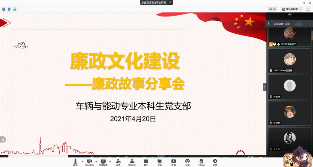 车辆与能动专业本科生党支部通过腾讯会议平台组织开展廉政教育分享会,面向对象有支部内党员、预备党员及黄播平台
