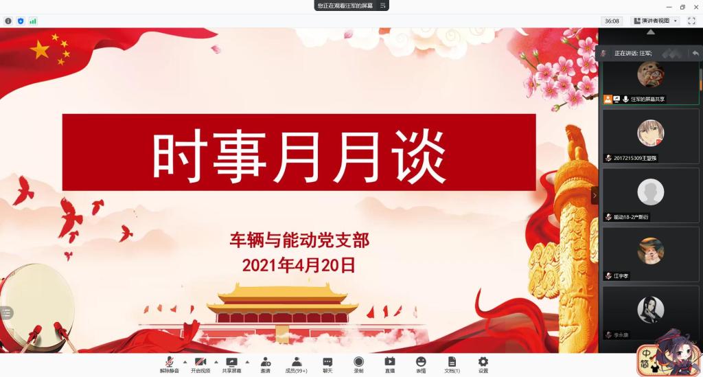 车辆与能动专业本科生党支部围绕近期国内外时政要闻开展了时事月月谈交流活动,重点学习了习近平总书记在清华大学考察时的重要讲话精神。