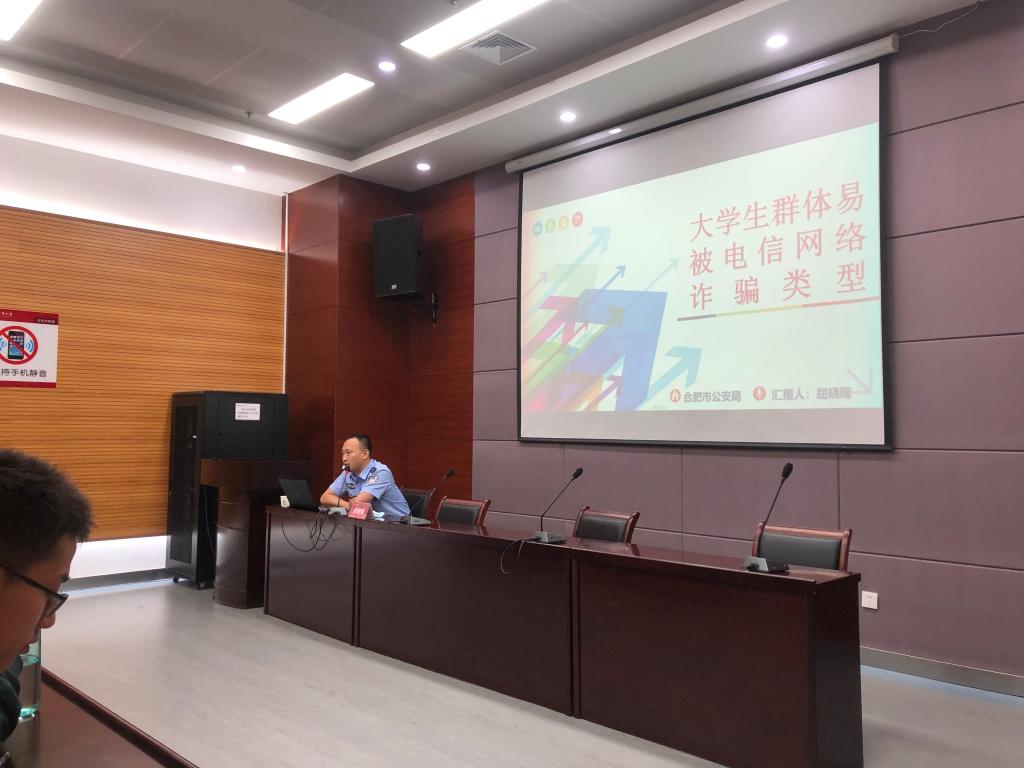 在翡翠湖校区科教楼第五会议室举办防范电信网络诈骗专题报告会。报告邀请合肥市公安局包河分局刑警三队屈晓隆副队长主讲,近100名本科生代表参加报告会。