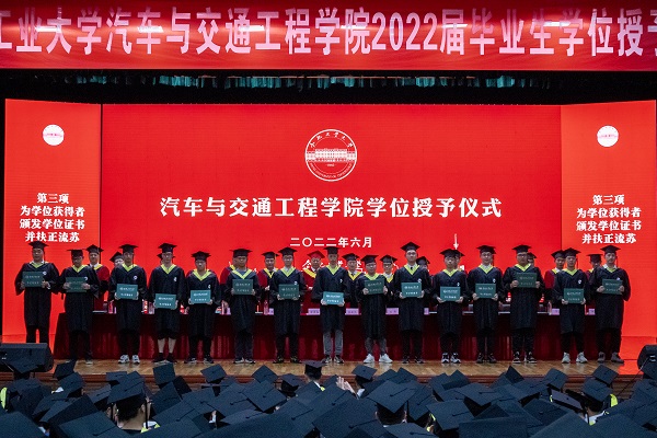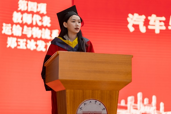 仪式上,郑玉冰老师作为教师代表发言,向取得学位的2022届毕业生表示祝贺,并勉励大家做披荆斩棘的实干者,常念家国之情、常怀报国之志、常思兴国之道;做朝气蓬勃的追梦者,要坚持学习、努力求真、脚踏实地、勇敢探索;做坚定勇敢的孤勇者,在人生道路上,嚼得了菜根、耐得住寂寞、守得好品格、触得到本真。2018级车辆工程创新实验班刘牧潇同学作为毕业生代表发言,他回顾了大学生活的点点滴滴,对母校及不辞辛劳的师长、父母,表达了最崇高的敬意和最衷心的感谢,他号召同学们坚守“厚德、笃学、崇实、尚新”的校训精神和专业发展方向,在汽车、交通领域砥砺奋斗,努力发展成为自觉服务国家的骨干和领军人才,以优异成绩书写人生华章。