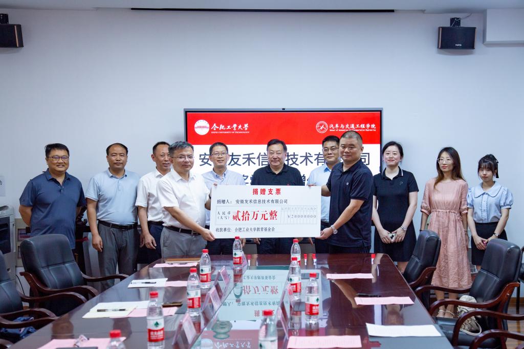 6月28日下午,“友禾奖学金”捐赠仪式在屯溪路校区格物楼506会议室举行。校友、安徽友禾信息技术有限公司总经理梁宏涛,副总经理章万俊和公司相关部门负责人,校党委副书记陈鸿海,院长龙建成,校友会办公室副主任沈时兴、王成山,院党委副书记张金伟等出席捐赠仪式。